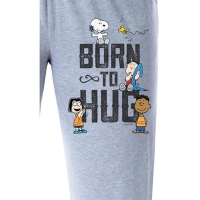 - CLASSIC DESIGN – These pajama pants feature Snoopy, Woodstock, Charlie Brown, Marcie, and Franklin with the phrase “Born to Hug.” This pajama is perfect for lounging about and enjoying all your favorite classic Peanuts media!